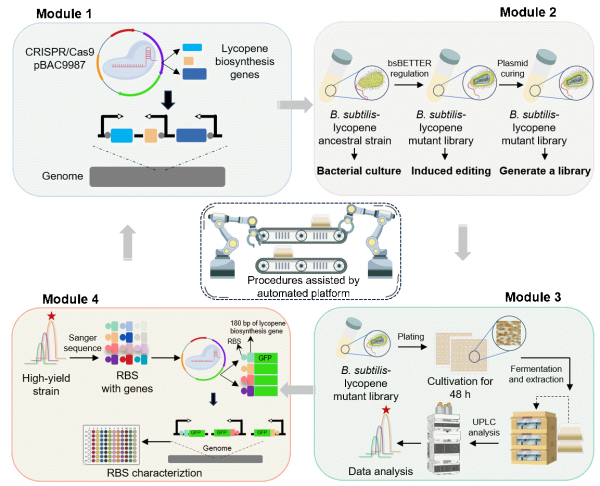研究为进一步提升筛选与验证效率,建立了两个自动化高通量平台体系。一是番茄红素高通量筛选平台,实现了从孔板发酵、自动化萃取到HPLC/UPLC-MS定量分析的全流程集成,可快速完成上万株突变体的并行筛选与验证,提升了表型检测通量和结果准确性;二是基于CRISPR的自动化基因组编辑与验证平台,可实现从编辑质粒设计与构建、突变体构建、质粒清除到菌株培养及荧光验证的全自动化操作,提高了多基因编辑效率与重现性,为复杂代谢调控提供了标准化工程基础。