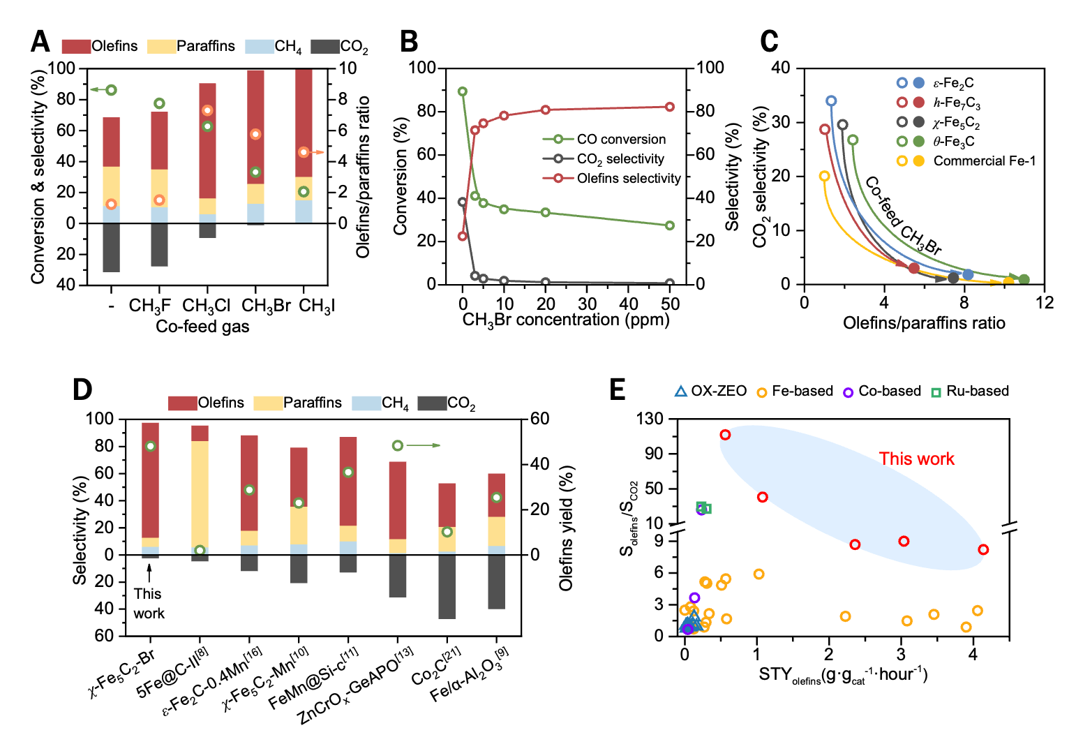 近期,中国科学院山西煤炭化学研究所结合表面化学势调控理论、自动化高通量实验,提出痕量卤代烷烃共进料调控策略。研究人员通过先进表征技术发现在反应气中引入百万分之一级的卤代烷烃,可在分子层面调节表面氧物种循环,从而动态调控催化剂表面催化性能:阻断H2O的解离,抑制水煤气变换副反应;阻止表面O与CO结合,近乎消除歧化反应生成的CO2;抑制烯烃加氢副反应,提升烯烃产率。上述策略无需改变催化剂配方,只在反应体系中引入微量卤素,即实现CO2近零排放与高烯烃选择性,具有即插即用的普适优势。