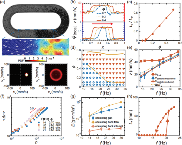 在这一系统中,当跑道中滚珠的面积分数超过临界密度后,系统自发成核产生一个高密度、高极化的“集群”。该集群作为一个整体在稀疏的气相中定向传播。这一新现象称为“集群相分离”,是Toner-Tu理论预测的三种群集斑图之一。该现象具有如下特征:均匀体相与尖锐界面,即集群内部和气相内部的密度和速度均匀,在交界处发生突变进而形成清晰界面;杠杆定律,即增加总密度只线性地增加集群长度,符合经典一级相变的杠杆定律;一级相变证据,即改变磁场频率观测到明显的滞后回线;相图特征,即实验明确各相的存在区域;正常粒子数涨落,即粒子数涨落是正常的(标准差与均值平方根成正比)。